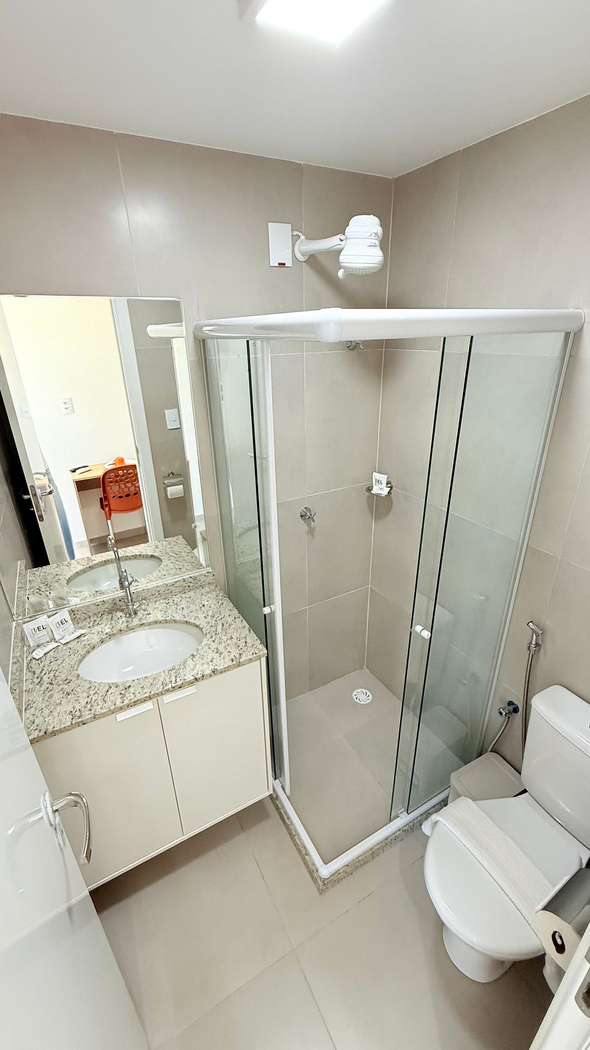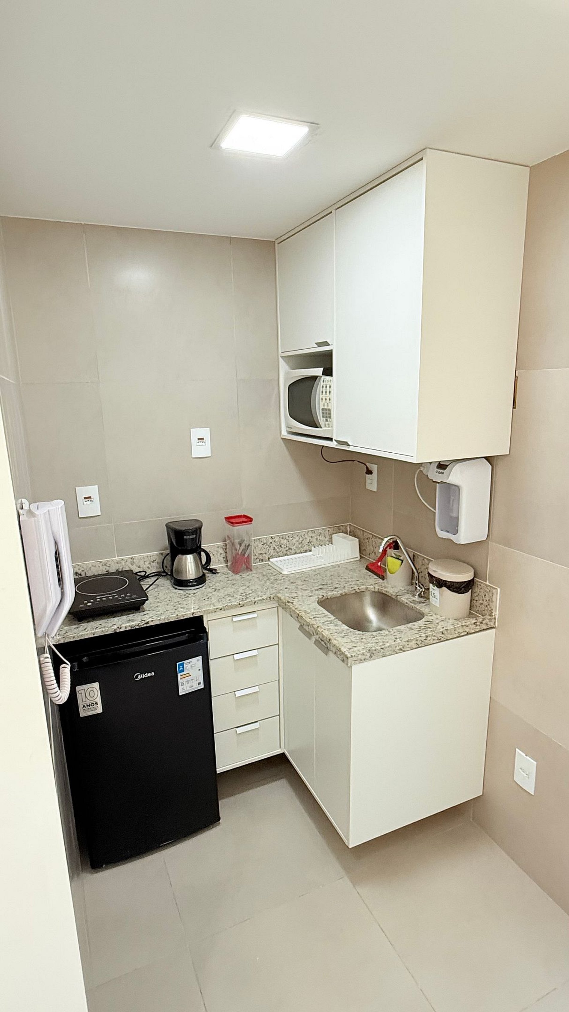 The modern kitchen is fully functional, equipped with a refrigerator, microwave, cooktop, coffee maker, and essential utensils — ideal for preparing breakfast or a quick meal. The bathroom features granite finishes, a refreshing shower, and thoughtful details for added comfort.