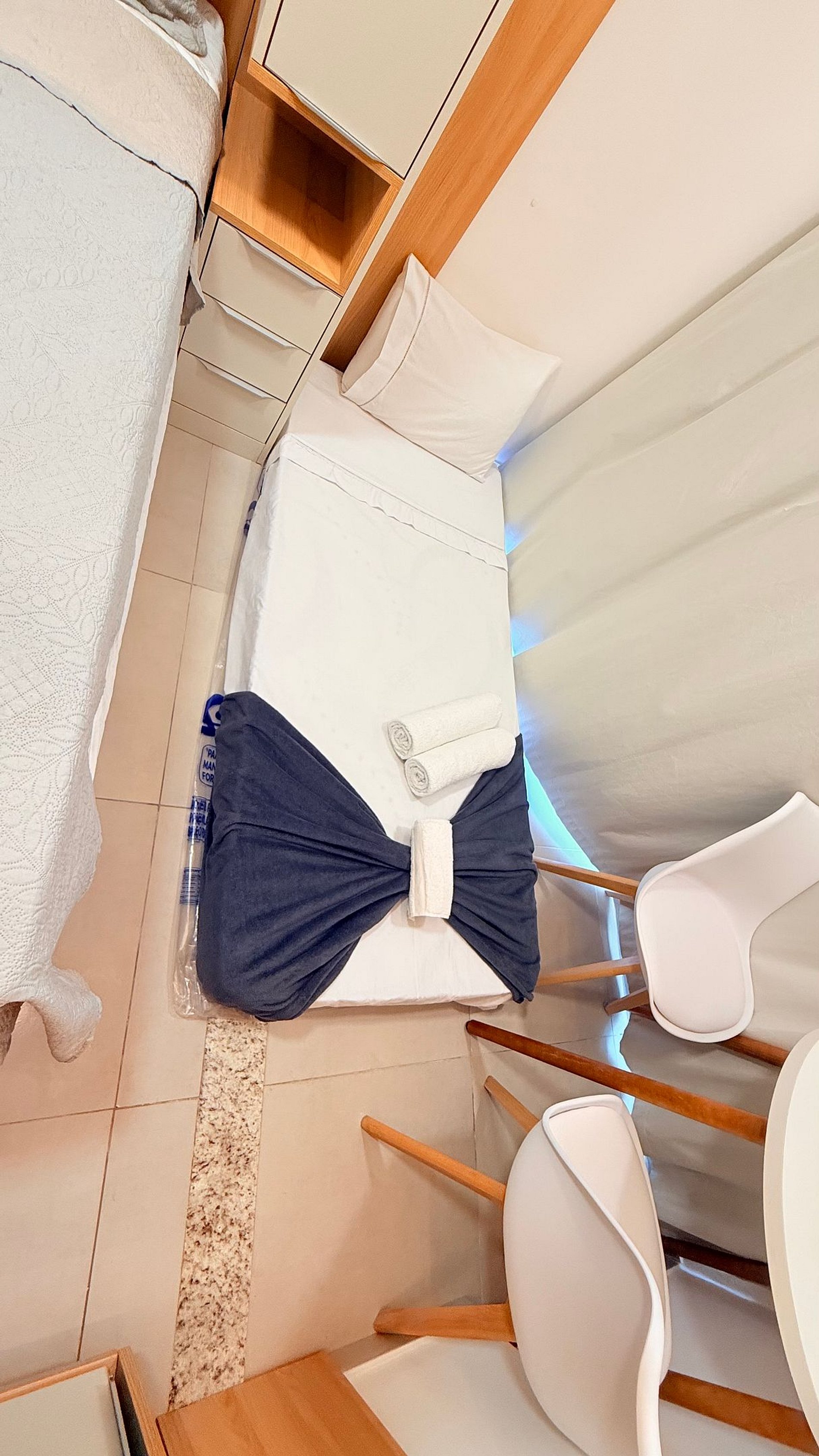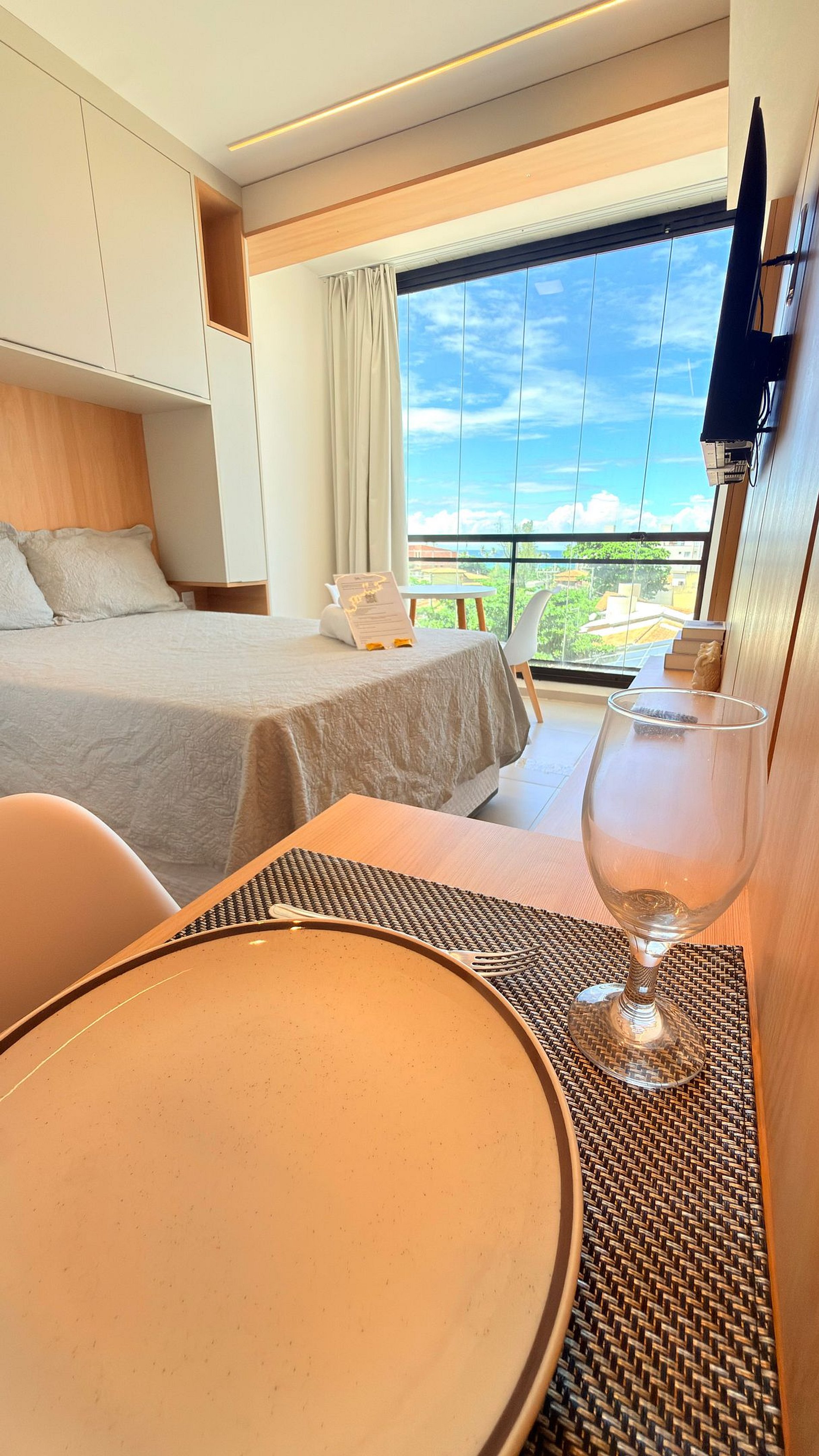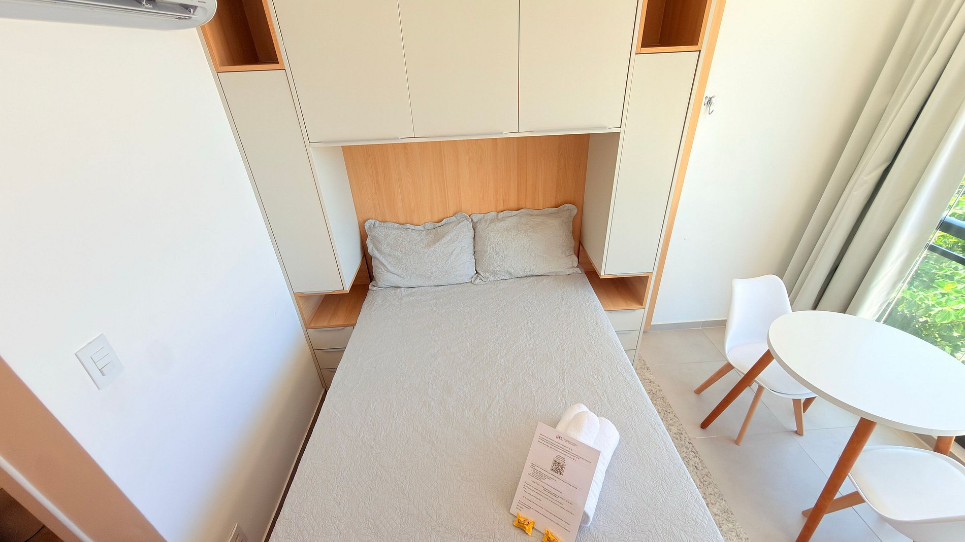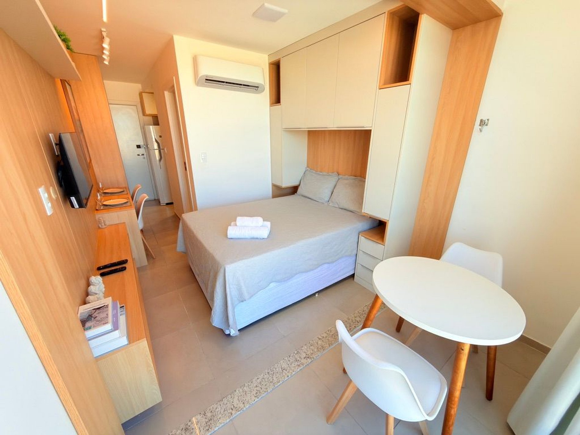 Modern and cozy studio with a comfortable bed, air conditioning, high-speed Wi-Fi, and Smart TV. Features a fully equipped kitchenette with cooktop, microwave, and coffee maker, plus a dining/work area. Modern bathroom with hot shower. Bright and airy space with natural light. Located near Stella Maris Beach, perfect for leisure or business stays with comfort and convenience.
