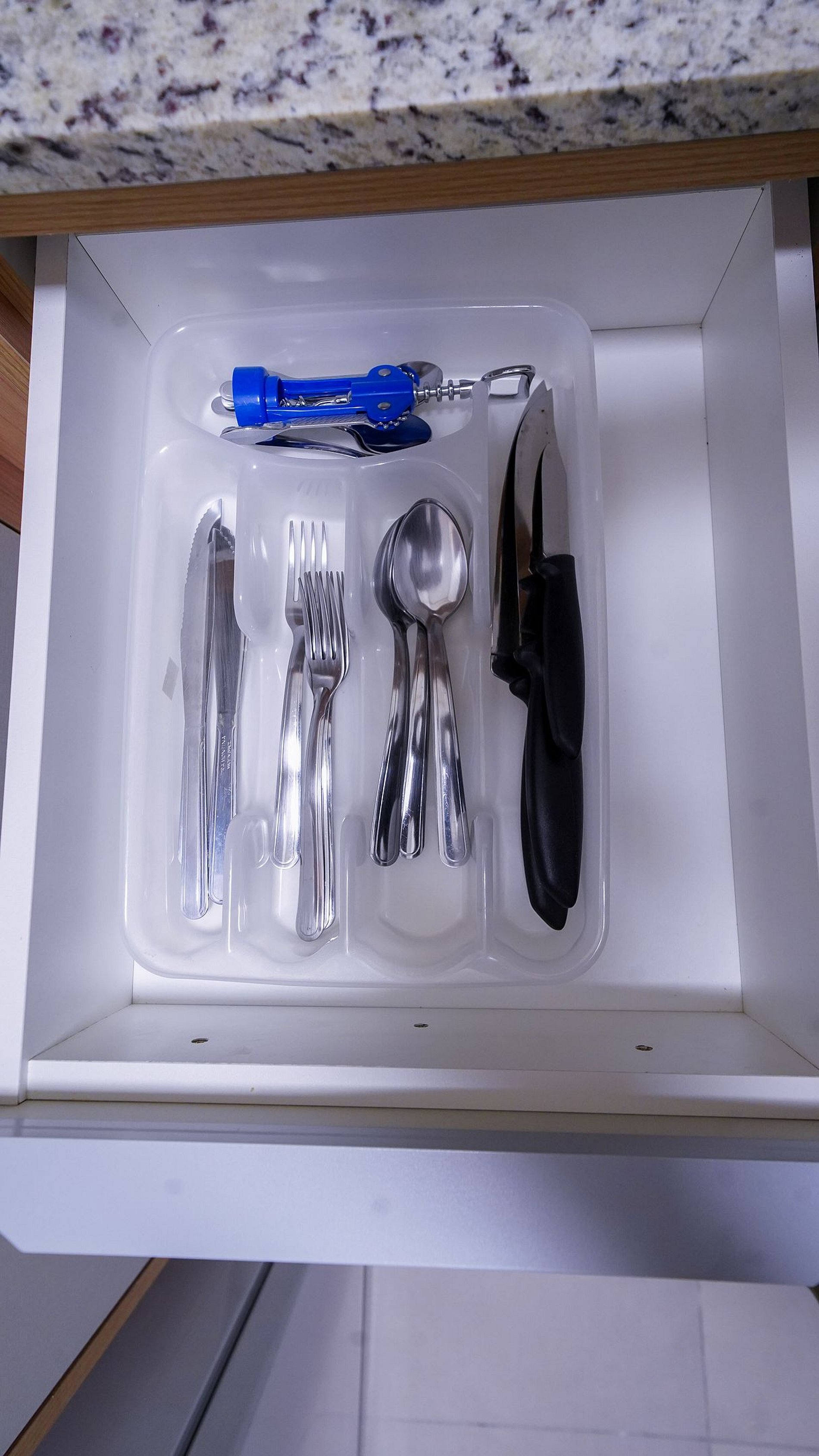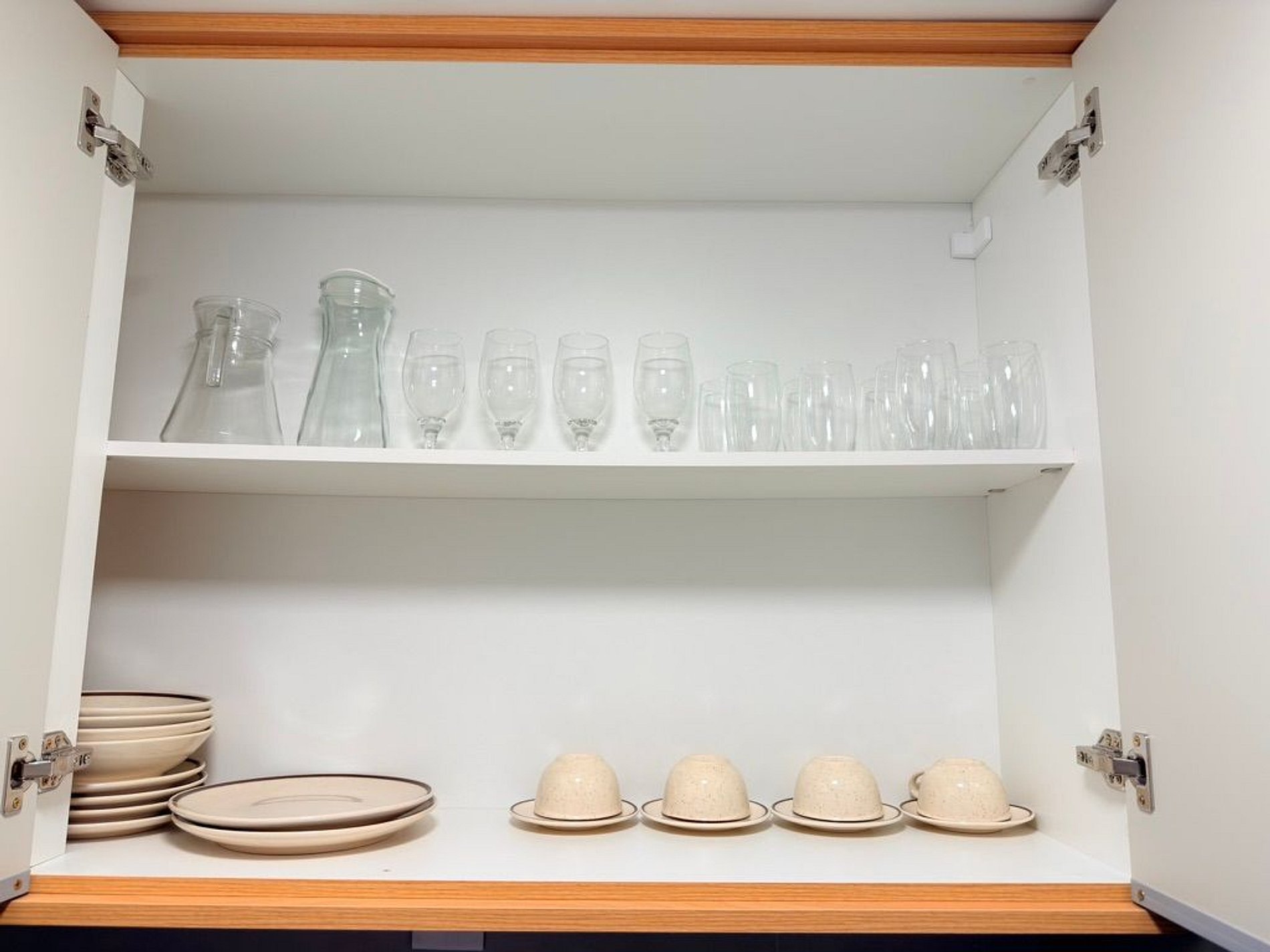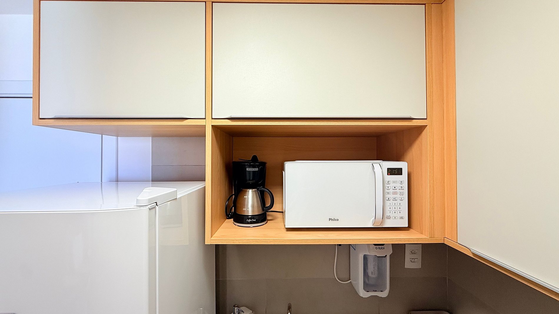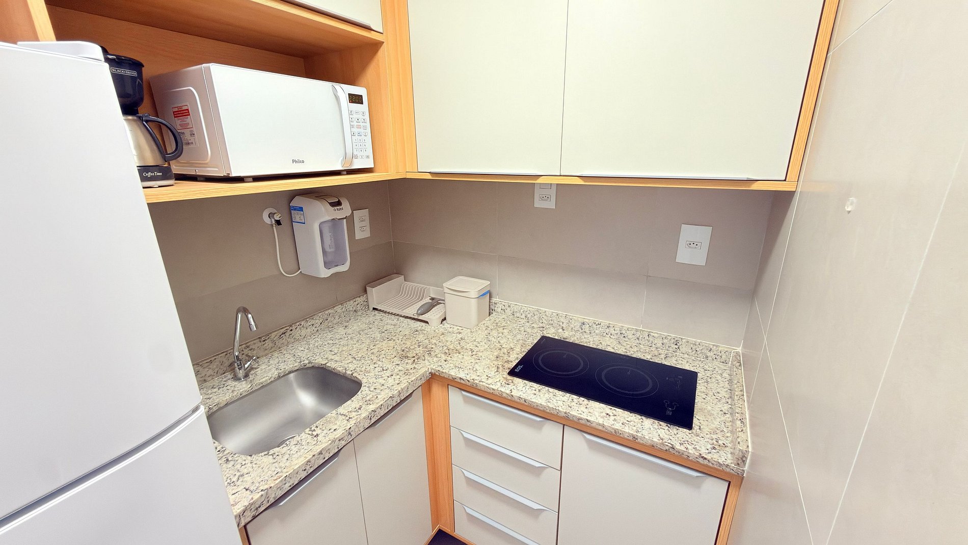 The fully equipped kitchenette includes a cooktop, microwave, coffee maker, and essential utensils, perfect for preparing quick meals. There is also a dining/work area, ideal for remote work or daily convenience.