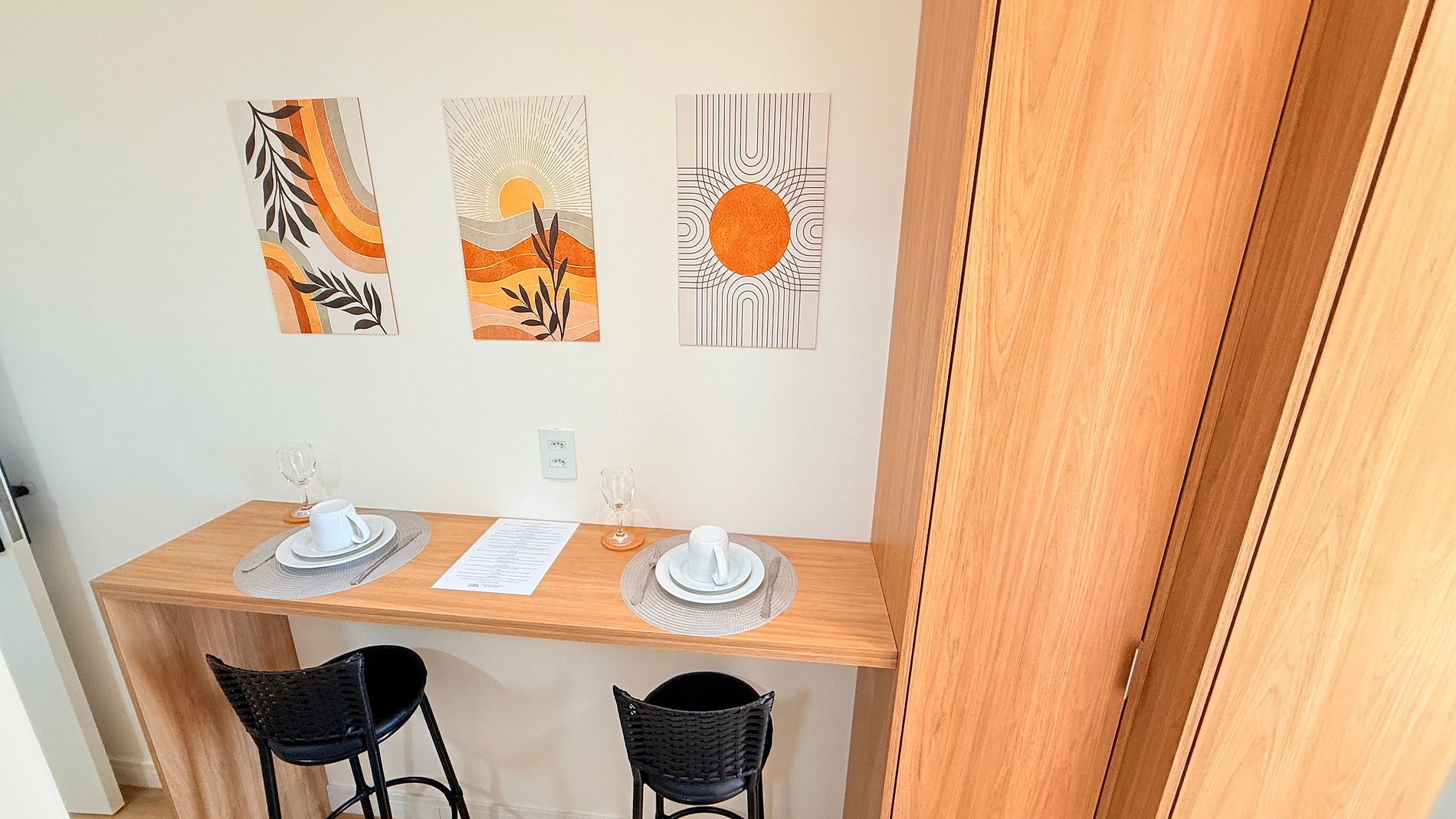 En la zona de estar y descanso, el mobiliario a medida optimiza cada metro cuadrado: escritorio amplio ideal para home office, TV moderna en panel de madera con decoración elegante y un toque natural con plantas. La cama es amplia y cómoda, con ropa de cama estilo hotel, edredones suaves y almohadas cuidadosamente seleccionadas para garantizar noches de descanso perfectas.