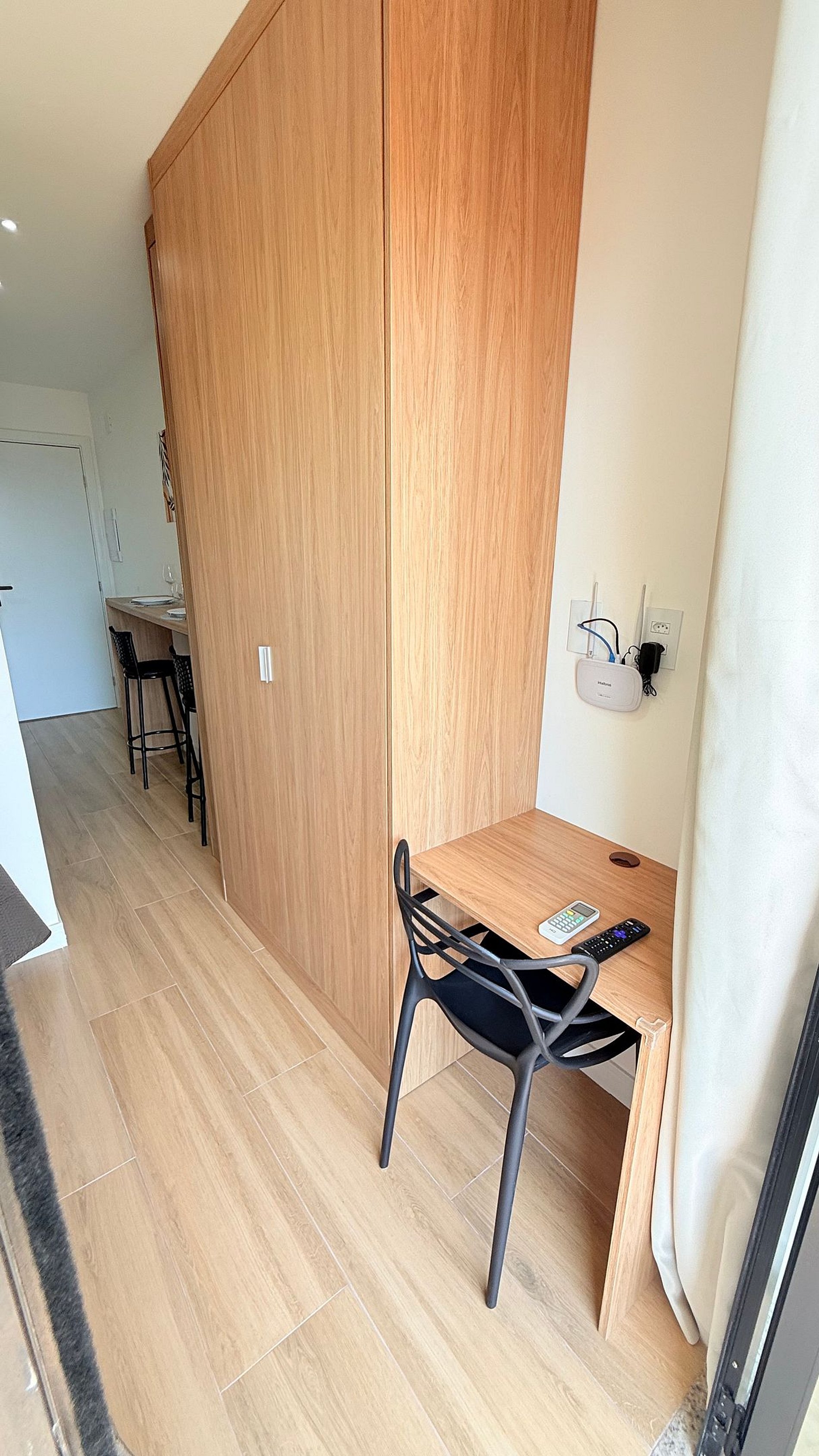 Na sala e quarto, o mobiliário sob medida otimiza cada metro quadrado: uma bancada de trabalho espaçosa, ideal para home office, uma TV moderna fixada em painel amadeirado com prateleira decorativa e um toque verde de plantas naturais. A cama é ampla e confortável, com enxoval de qualidade hotel, edredons macios e almofadas cuidadosamente escolhidas para garantir noites de sono reparadoras.
