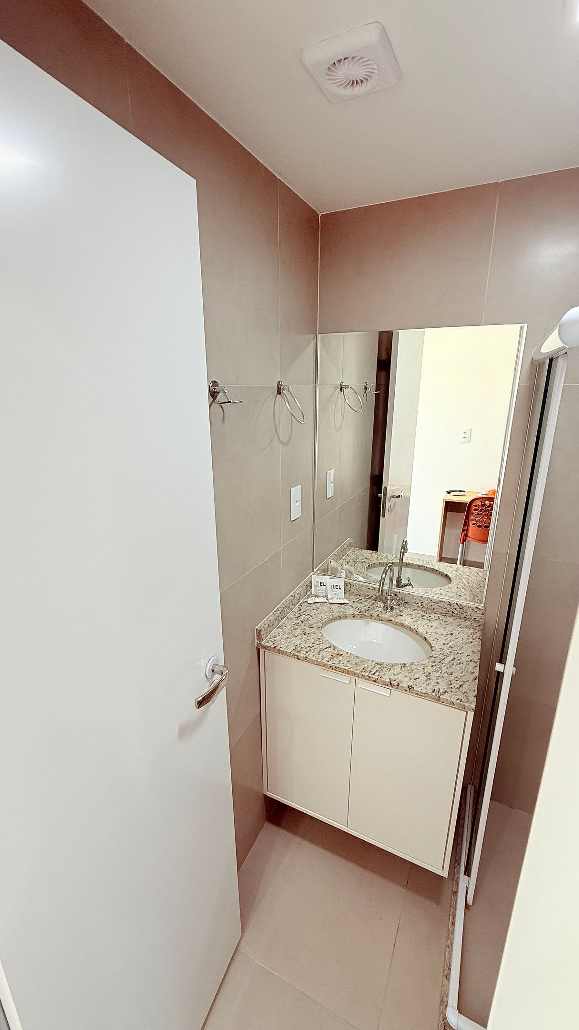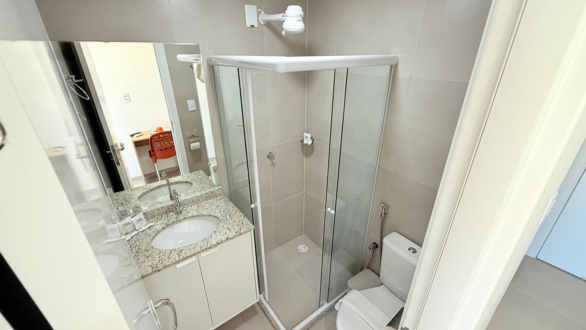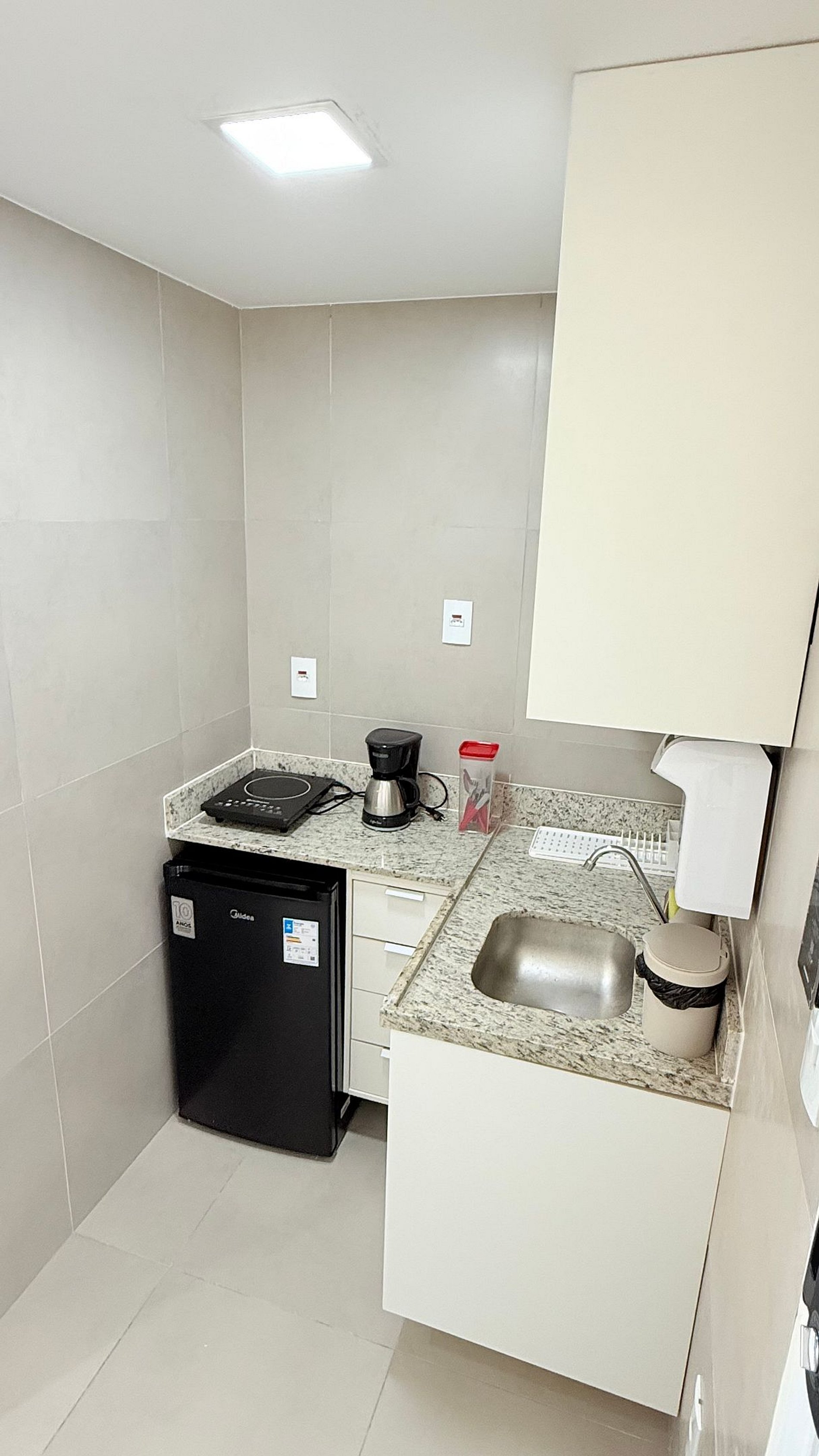 A cozinha é moderna e funcional, equipada com frigobar, micro-ondas, cooktop, cafeteira e utensílios essenciais — perfeita para preparar um café da manhã ou uma refeição rápida. O banheiro conta com acabamento em granito, ducha relaxante e detalhes que garantem praticidade e conforto.