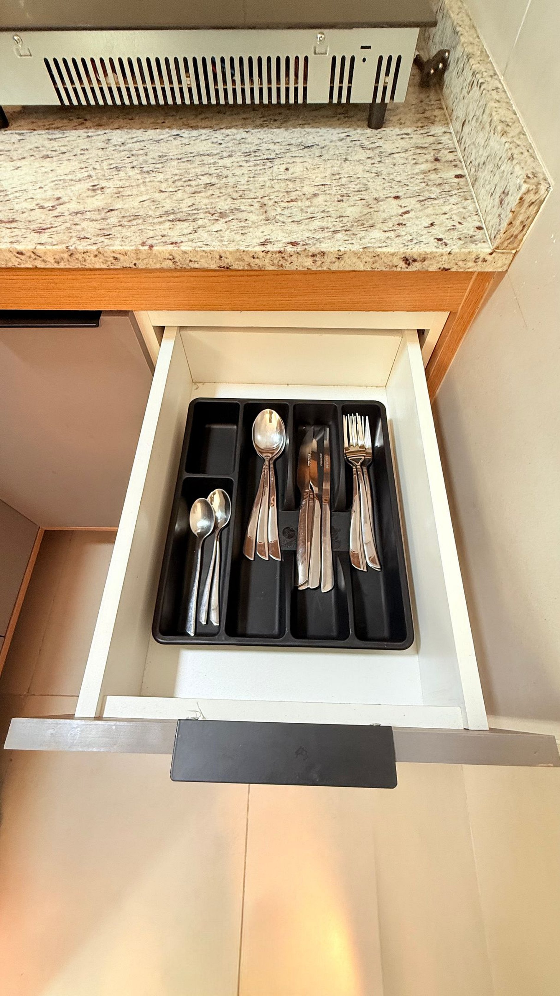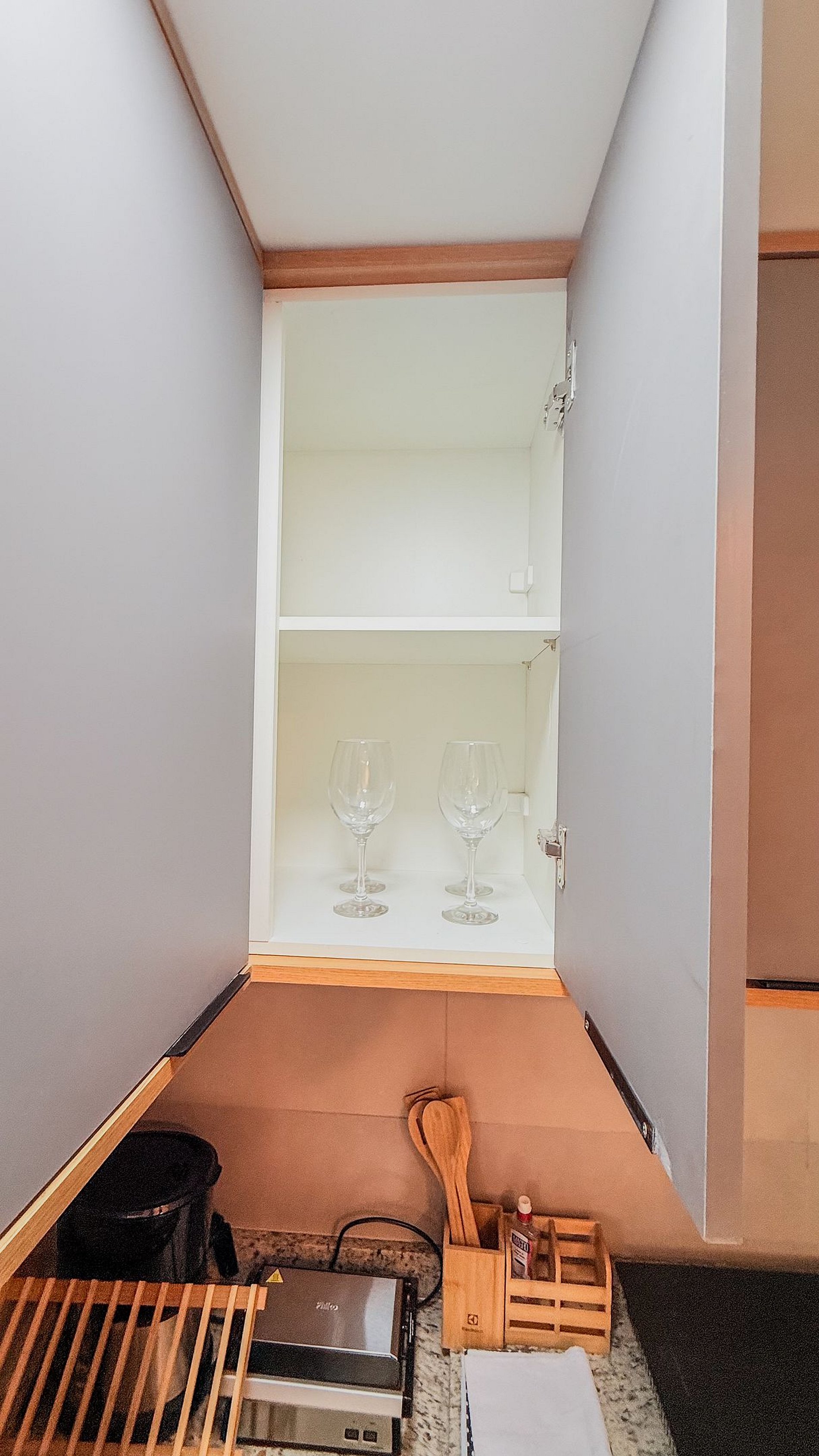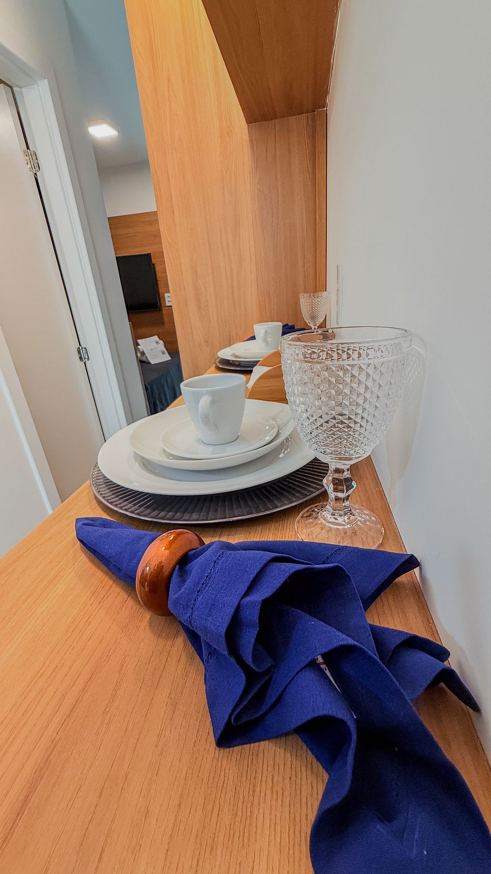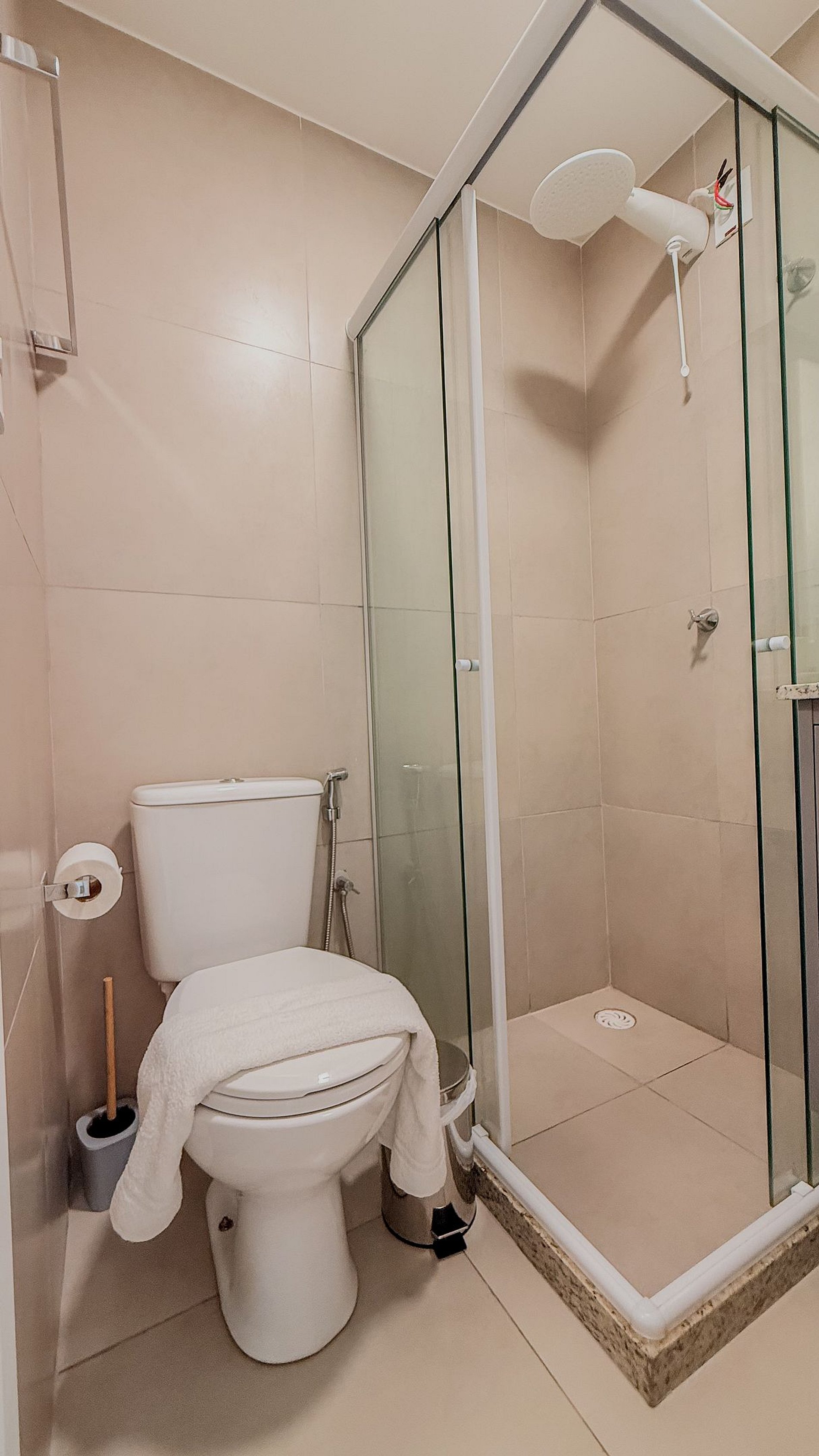 A cozinha é moderna e funcional, equipada com geladeira, micro-ondas, cooktop, cafeteira e utensílios essenciais — perfeita para preparar um café da manhã ou uma refeição rápida. O banheiro conta com acabamento em granito, ducha relaxante e detalhes que garantem praticidade e conforto.
