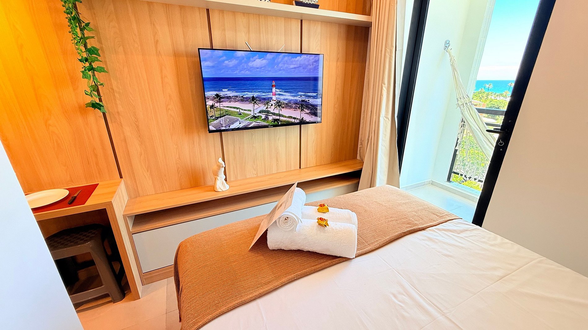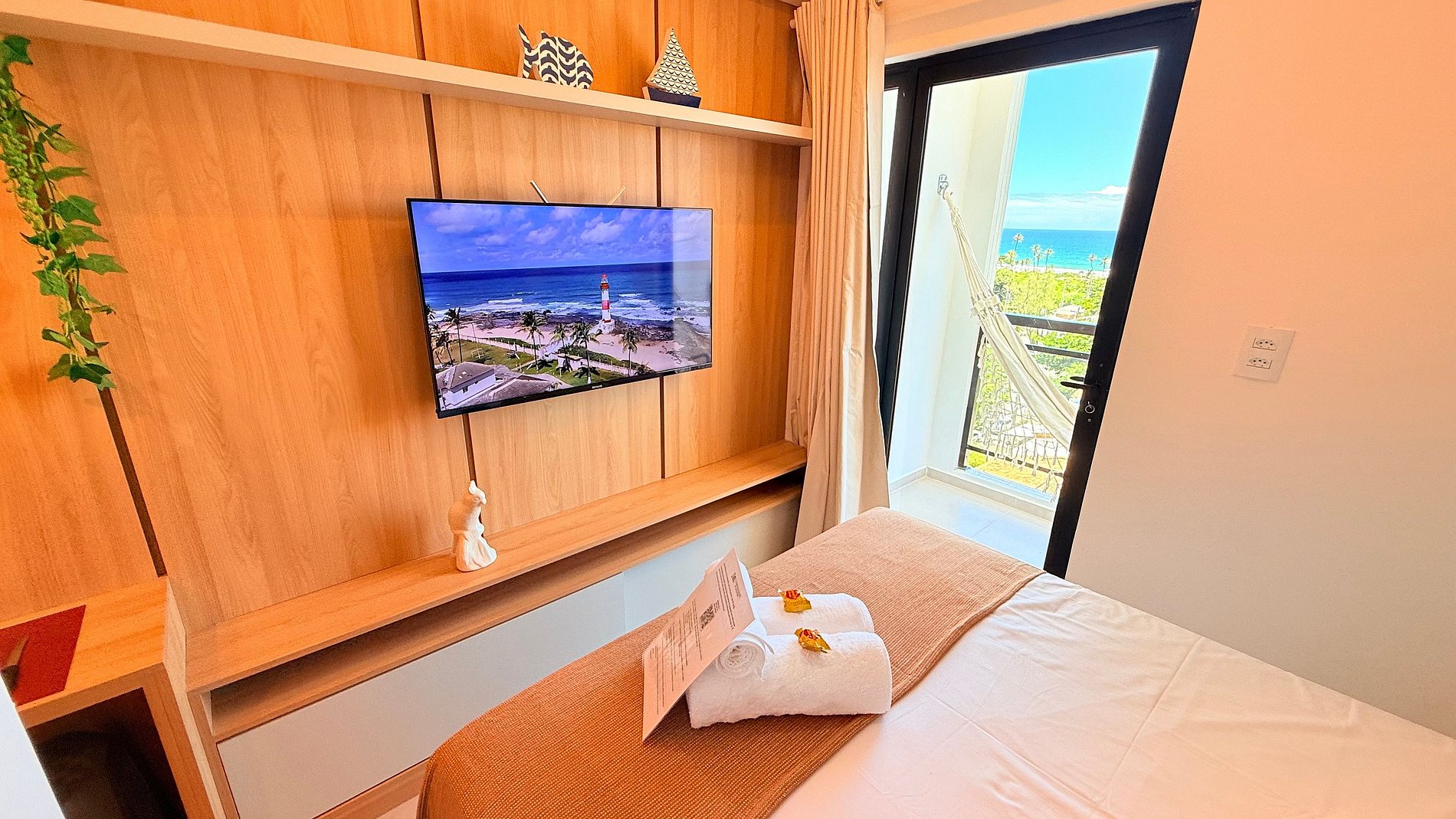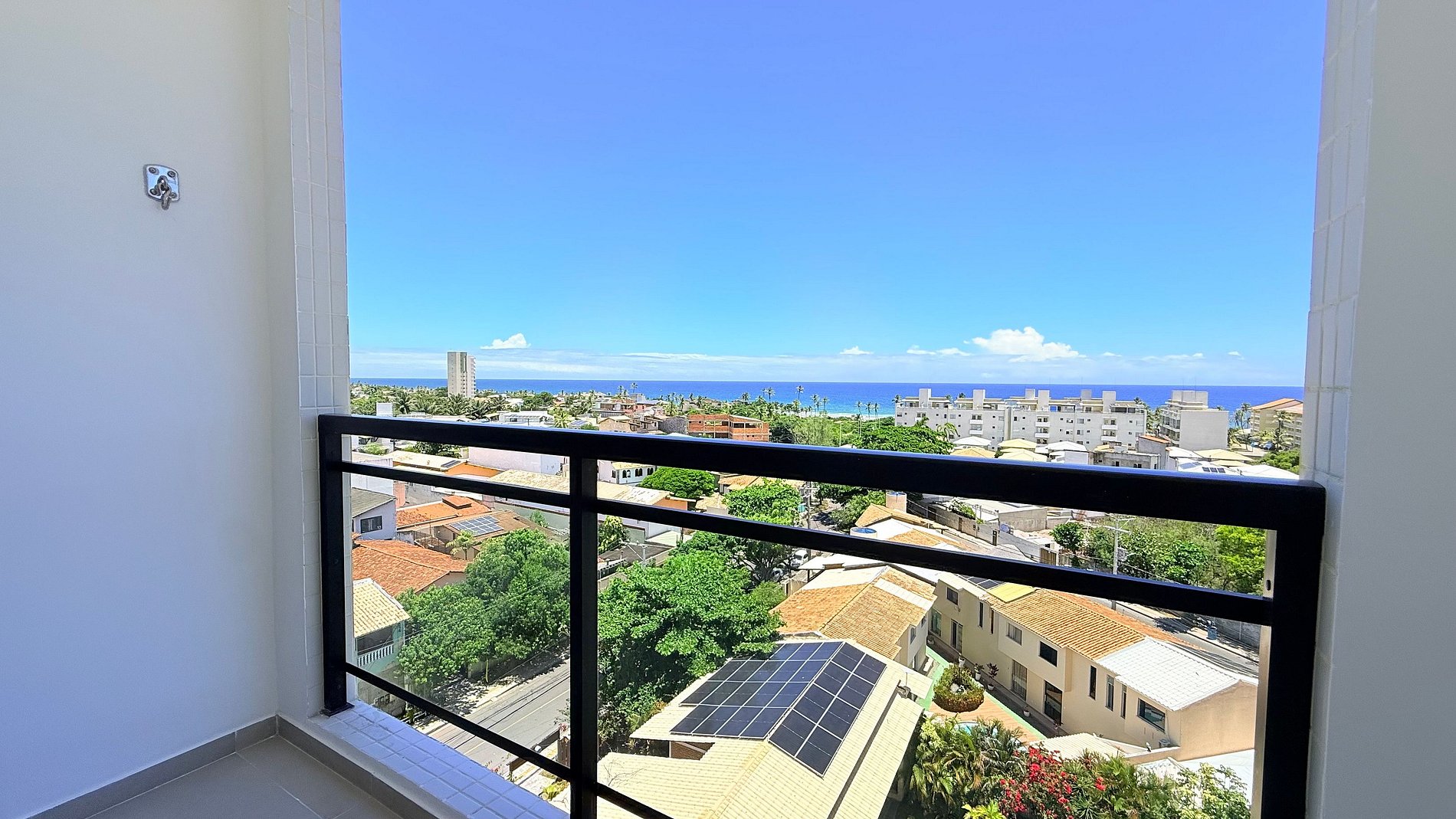 Um dos grandes destaques do apartamento é a varanda privativa com rede, oferecendo uma vista aberta para o bairro e o mar ao fundo, ideal para relaxar, sentir a brisa e apreciar o pôr do sol.