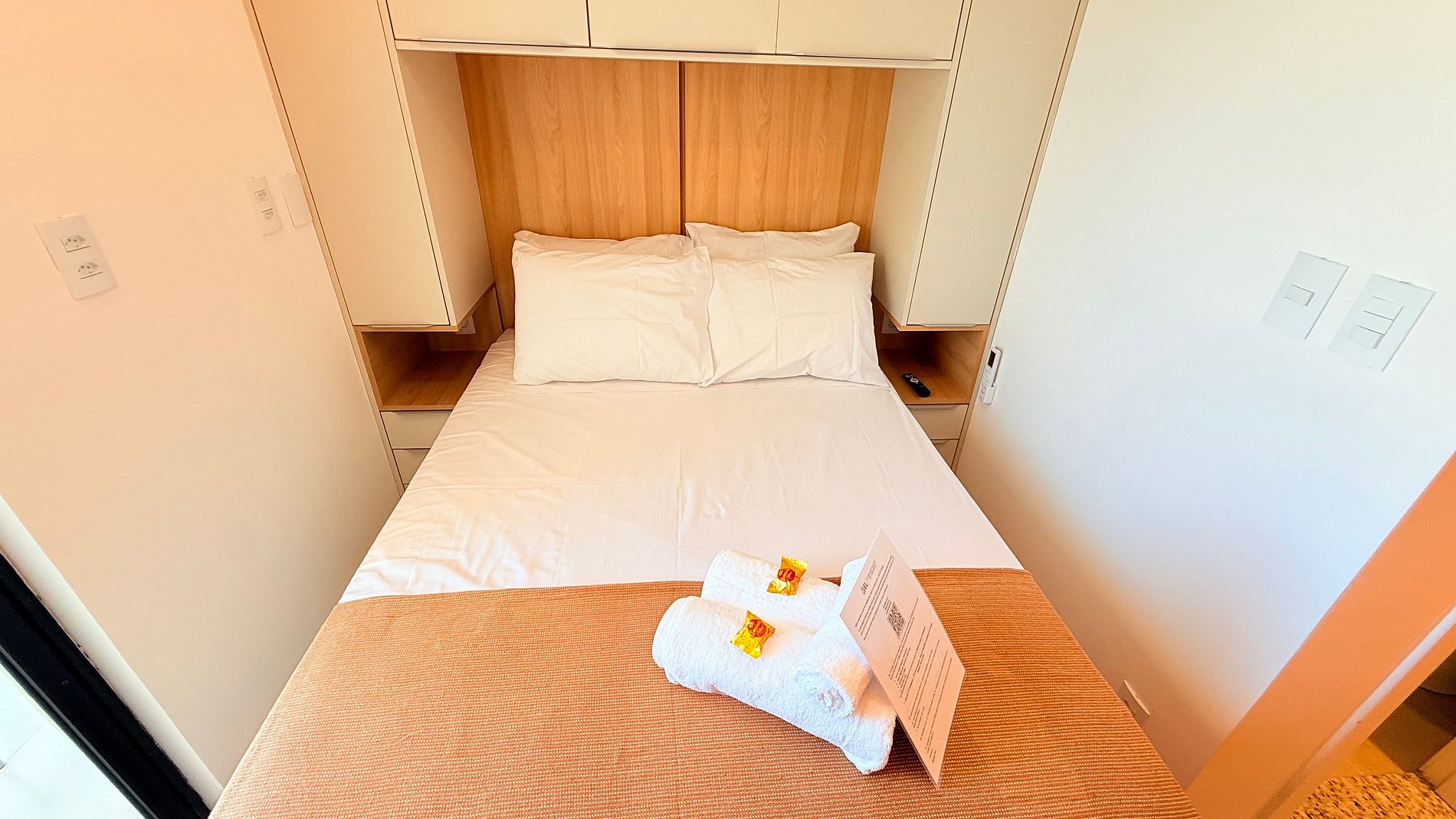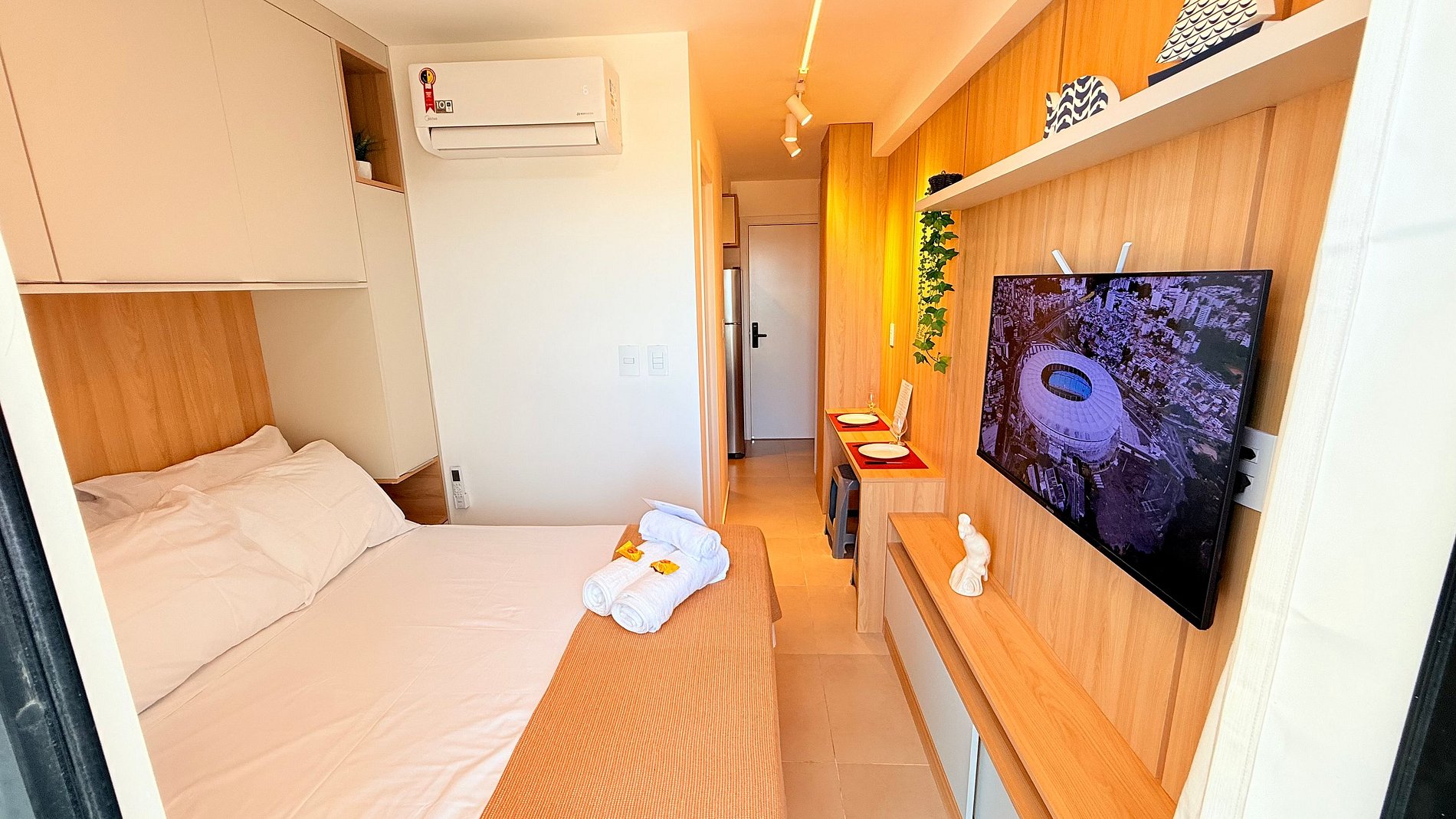 O espaço conta com cama de casal confortável, enxoval completo de alta qualidade, ar-condicionado split, iluminação moderna e TV de tela plana, criando um ambiente agradável e silencioso.