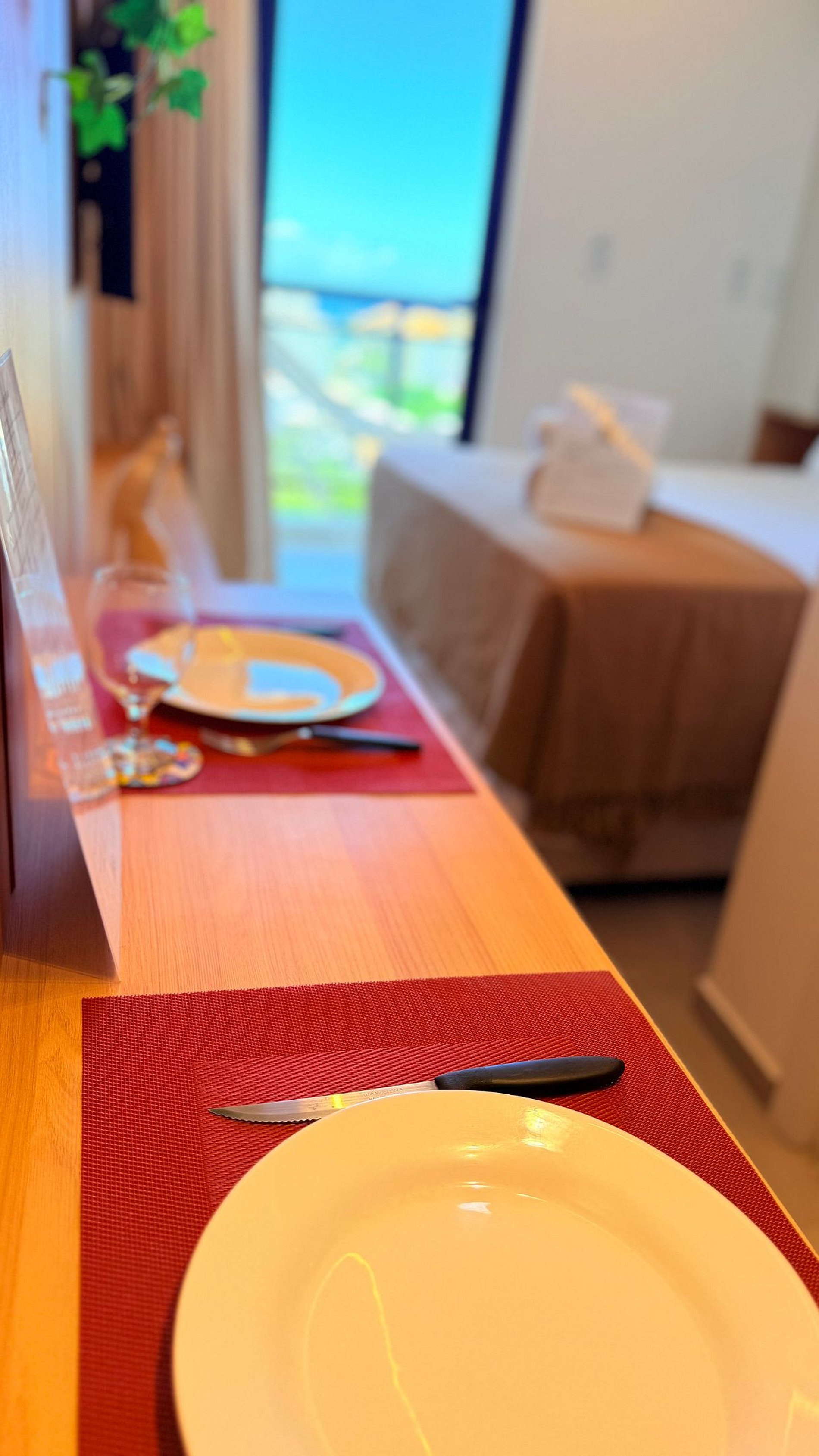 A área de refeições conta com mesa para duas pessoas, perfeita para refeições, trabalho remoto ou momentos de descanso.