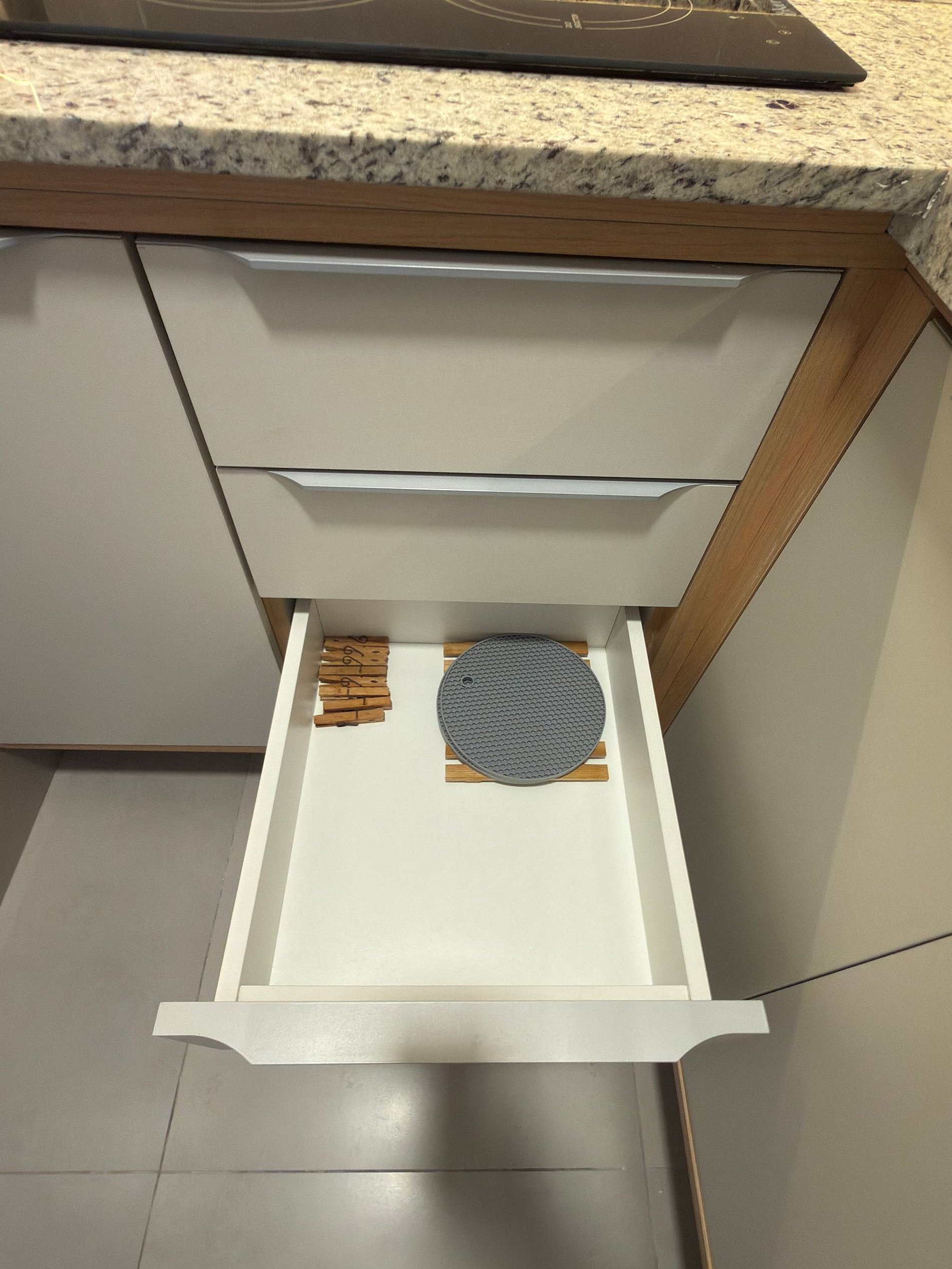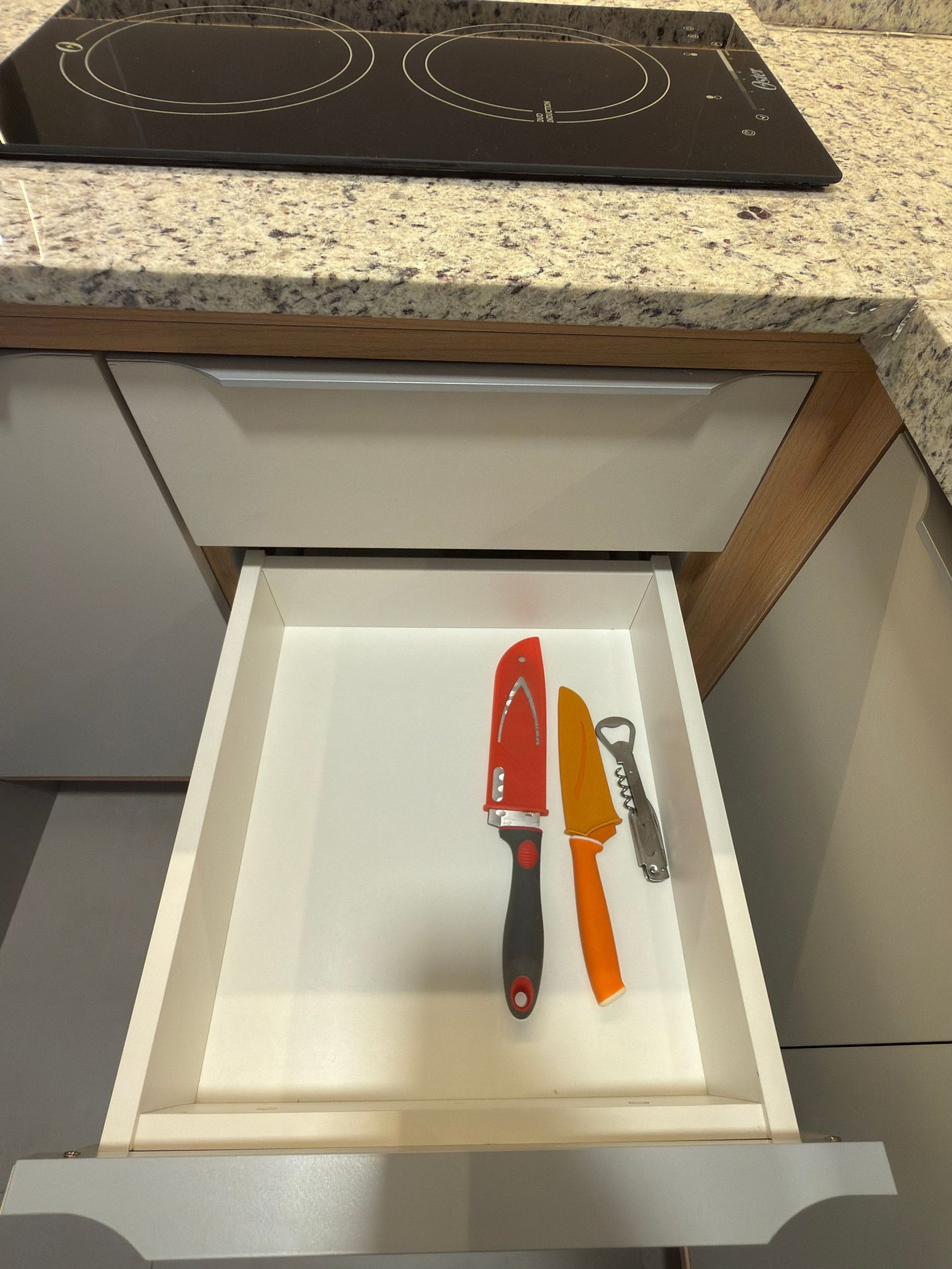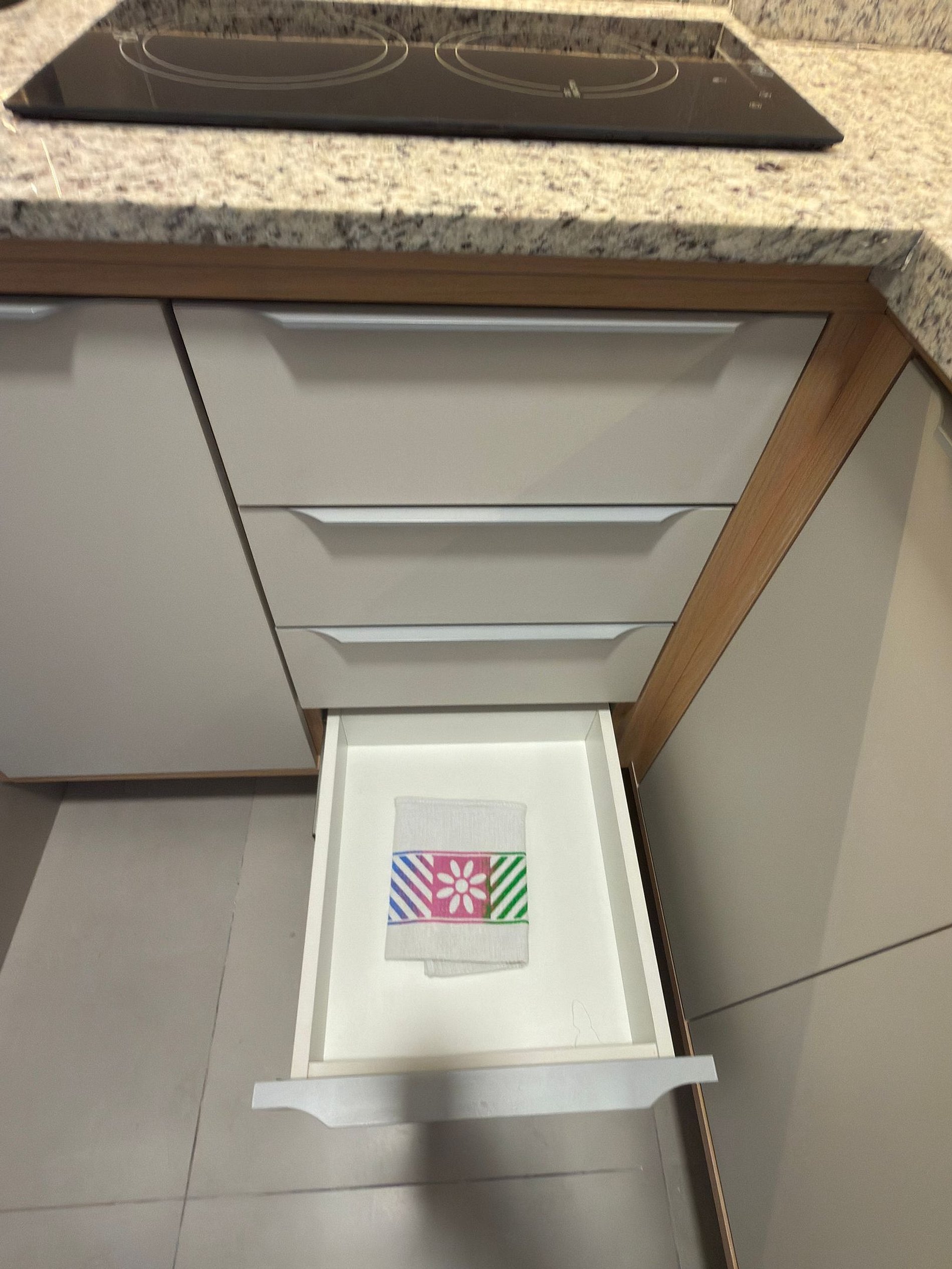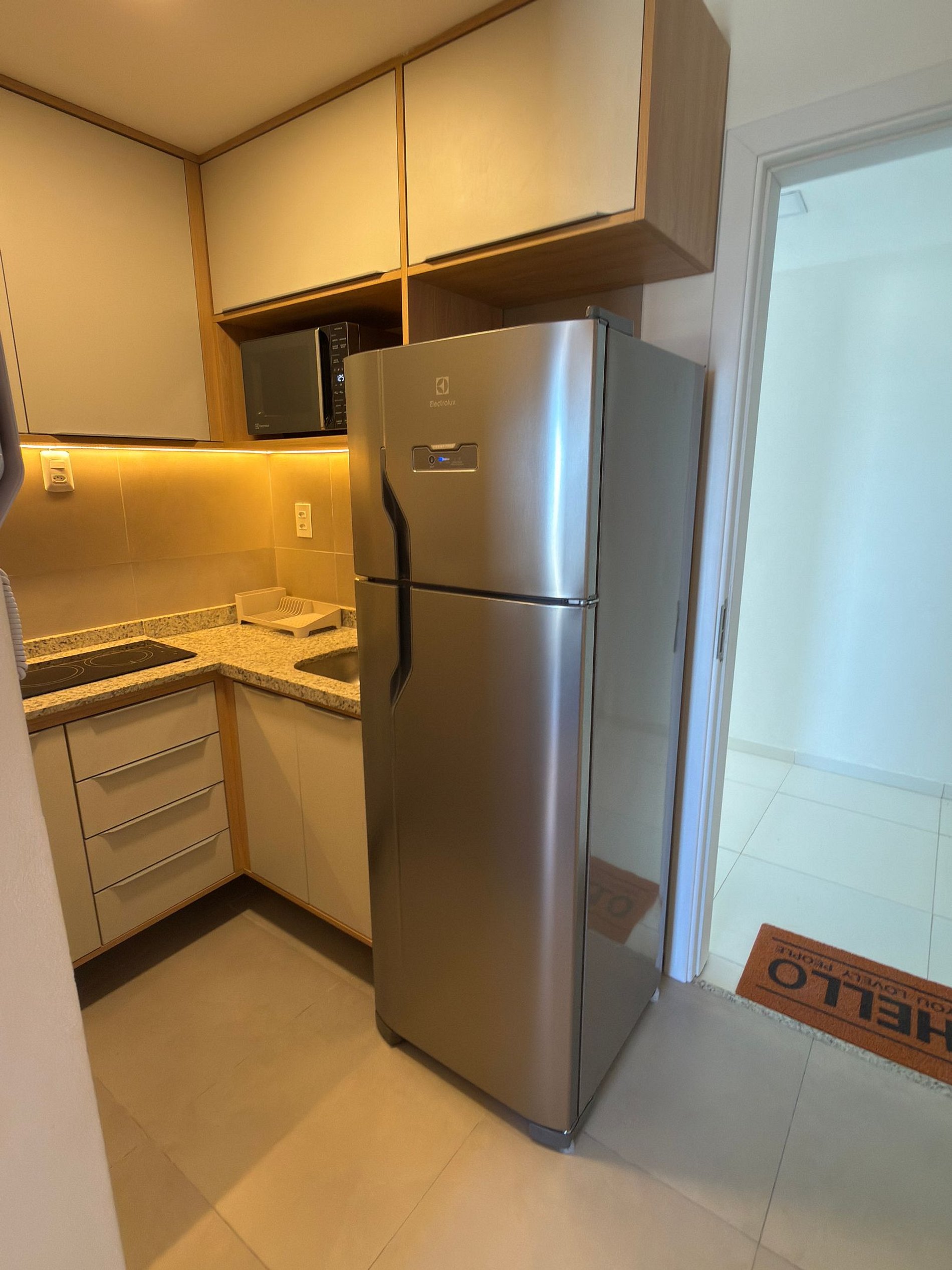 A cozinha compacta e totalmente equipada possui cooktop por indução, micro-ondas, geladeira frost free, pia em granito, armários planejados, utensílios básicos, louças e itens essenciais para refeições rápidas ou estadias mais longas.