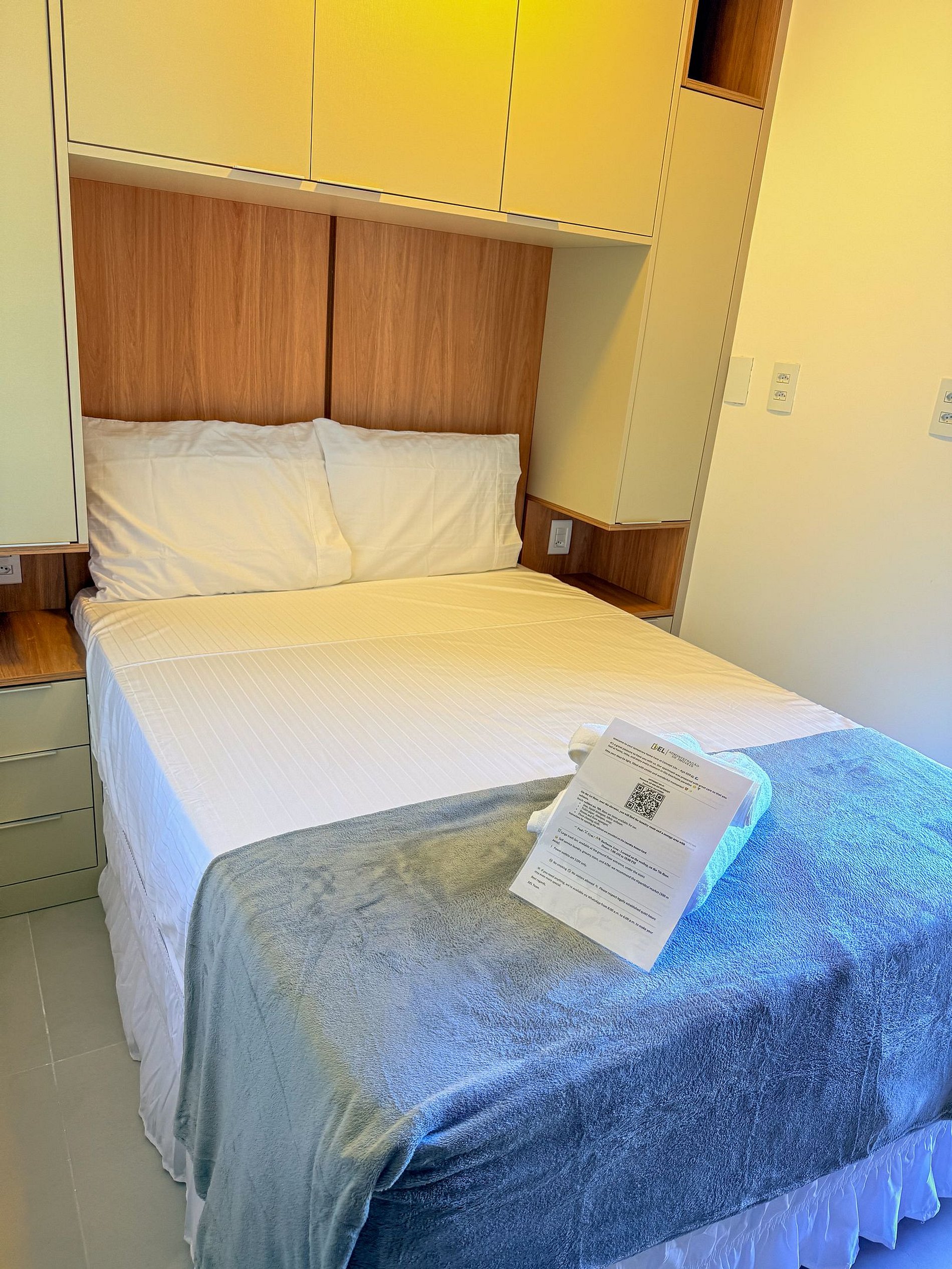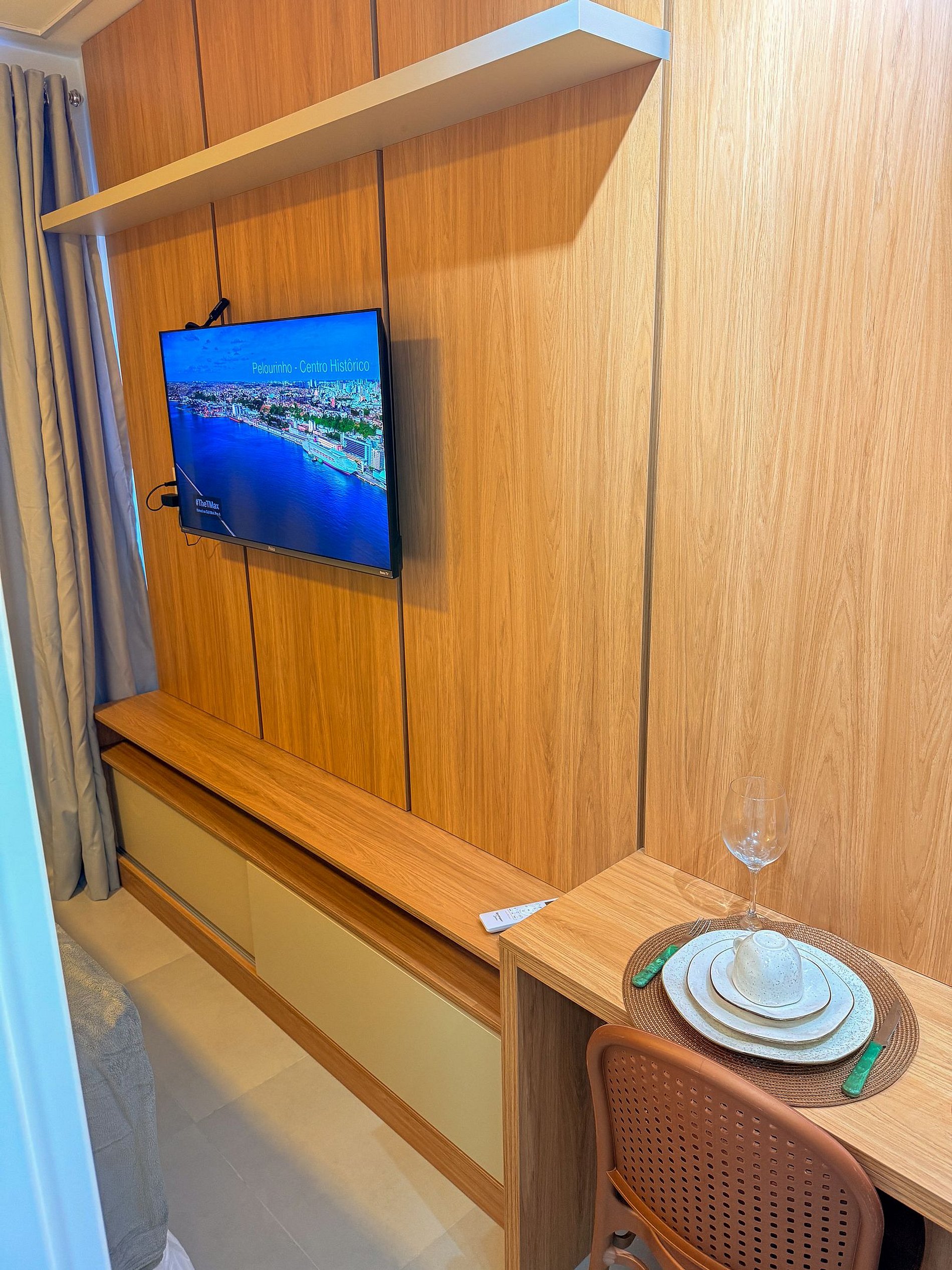 Na sala e quarto, o mobiliário sob medida otimiza cada metro quadrado: possui uma TV moderna fixada em painel amadeirado com prateleira decorativa. A cama é ampla e confortável, com enxoval de qualidade de hotel, edredons macios cuidadosamente escolhidas para garantir noites de sono reparadoras.